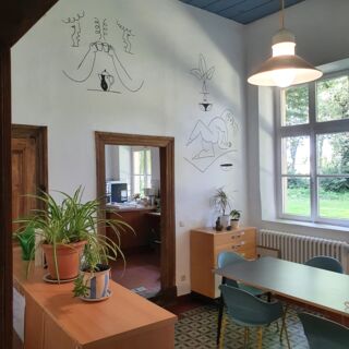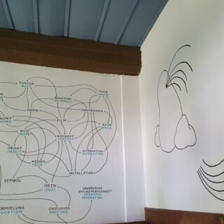 The mural in the common kitchen of the artists' village Schöppingen is to be understood as a stimulus to reflect on deadlocked patterns of thought and practice, to think social structures fluidly and to enter into a mutual discourse.